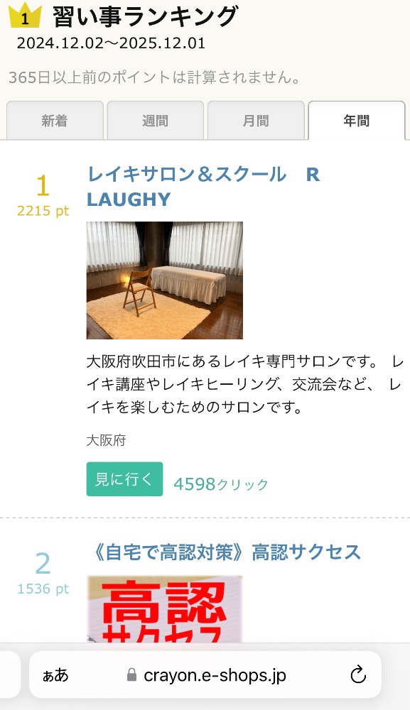 ホームページクレヨンサイトの習い事ランキングでレイキ教室アールラフィのホームページが皆さんが、投票してくれていたおかげで全国1位になりました😊全国で1位って、すごい!!大阪 吹田市 五月が丘 美容室 美容院 ヘアサロン カット カラー ヘアカラー パーマ トリートメント よもぎ蒸し 足つぼ リフレ マッサージ レイキ ヒーリング レイキ教室 体調不良 レイキサロン 全国1位 運気